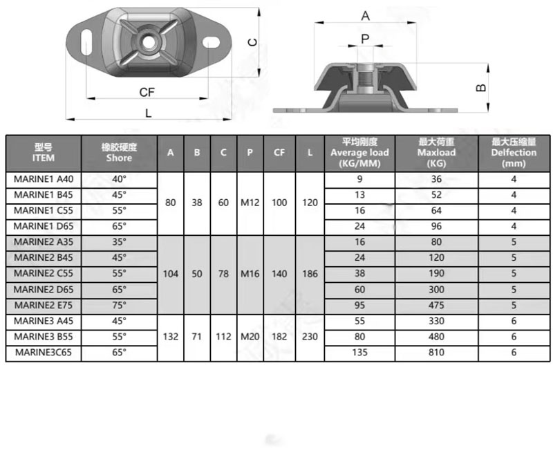 Description: the FRH, FRS rubber mounting is one of bell-type shock absorber with professional technology and inimitable formulation and full sets of injection moulds without mould line and nothing mould cost.. The top is round cap of female screw made with high quality zinc coated metal sheet, the bottom is support metal sheet with 2 stockets, the middle is high quality rubber of NBR, NR with full adhesive between the rubber and metal parts. It can reach the height effect for the vibration in the axial pressure and lateral pressure, especially used in generators, engines systems motor and so on, work range around 500-3500HZ at FRS mounting and 1500-3500HZ at FRH mounting. The product inner structure is the rubber strong bonding with the metal, in addition there is a small rubber compress but higher load, and it help to get more safety with special design of safety lock in the middle, locking the product. It is very reliable and durable. Apply to anti-vibration and shock absorption for all kinds generators, engines, motors, compressor, pump, refrigerator and other metal system.