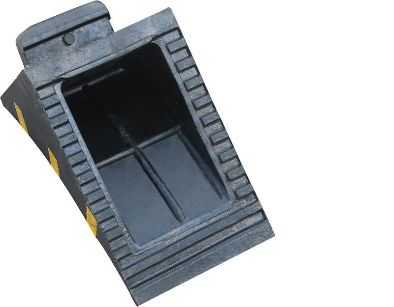 Secure-grip rubber wheel chocks don't slide on pavement to ensure the chock holds fast. Rubber is weather resistant and suitable for use with trailers, trucks, and commercial construction equipment. They are less durable than laminated rubber chocks.