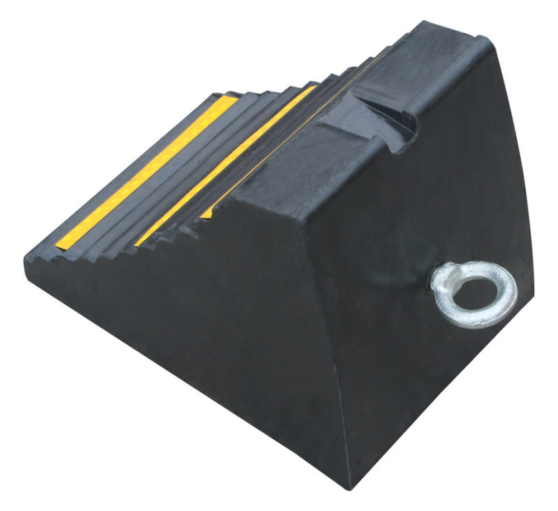 Wheel chocks (also called wheel immobilizers or chock blocks) are designed to help prevent vehicles from accidentally rolling when parked, especially on a grade. Primarily for the safety of workers when a vehicle is undergoing maintenance, or being loaded or unloaded, use of wheel chocks can also reduce property damage from accidents and loss from spillage during loading operations. Wheel chocks are typically wedge shaped, and the size required depends on the weight of the vehicle, the size of the tires, the steepness of the grade, and the quality of the road surface. Large wheel chocks are usually made of a durable material with a high strength-to-weight ratio, and include handles or ropes to facilitate manual deployment. Occupational Safety and Health Administration (OSHA) and Mine Safety and Health Administration (MSHA), both agencies of the U.S. Department of Labor, require wheel chocks in several specific situations (including when parking on a grade and during loading operations).